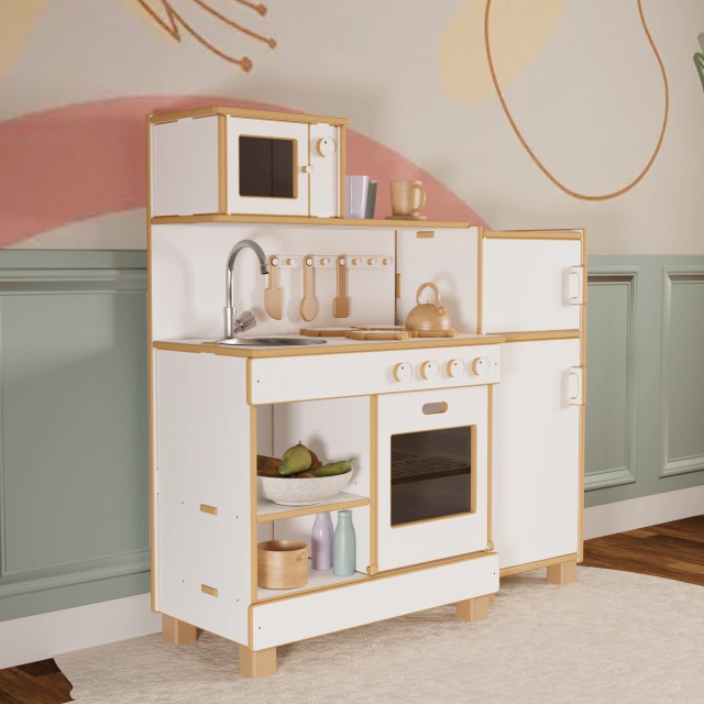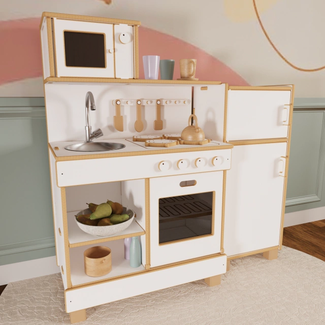 O conjunto inclui uma pia, fogão com micro-ondas e geladeira, compondo um espaço completo para as crianças explorarem o mundo das brincadeiras de forma criativa. Cada peça foi cuidadosamente projetada para ser segura e funcional, com detalhes que tornam a interação intuitiva e inesquecível.