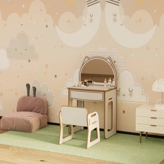 Ideal para os pequenos que adoram se expressar, brincar de se arrumar ou imitar os adultos, essa penteadeira é mais do que um móvel: é um cenário de imaginação e descobertas. Com detalhes em formato de orelhinhas de gatinho e espelho, ela traz charme e diversão ao ambiente, além de contribuir com o desenvolvimento da autoestima e senso de organização das crianças.